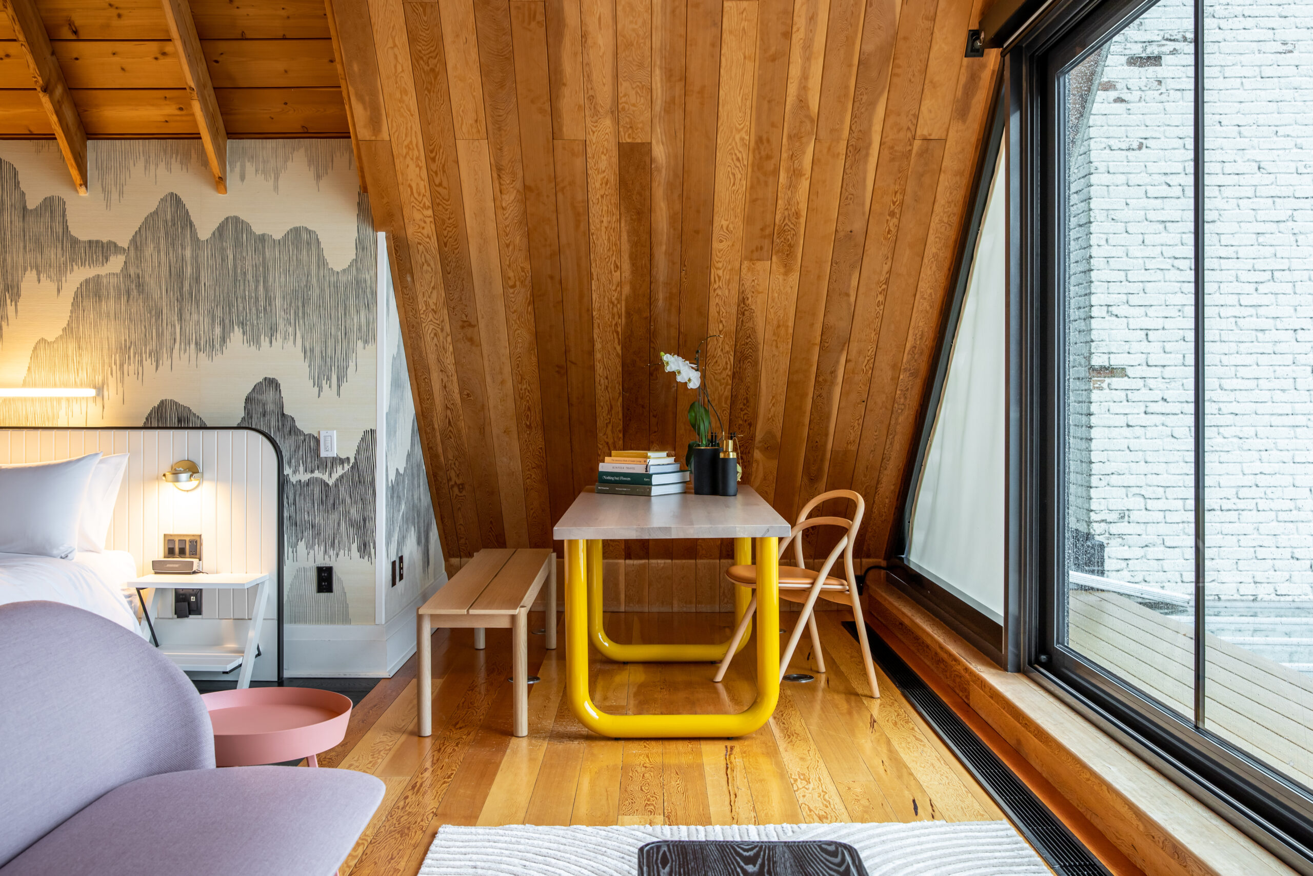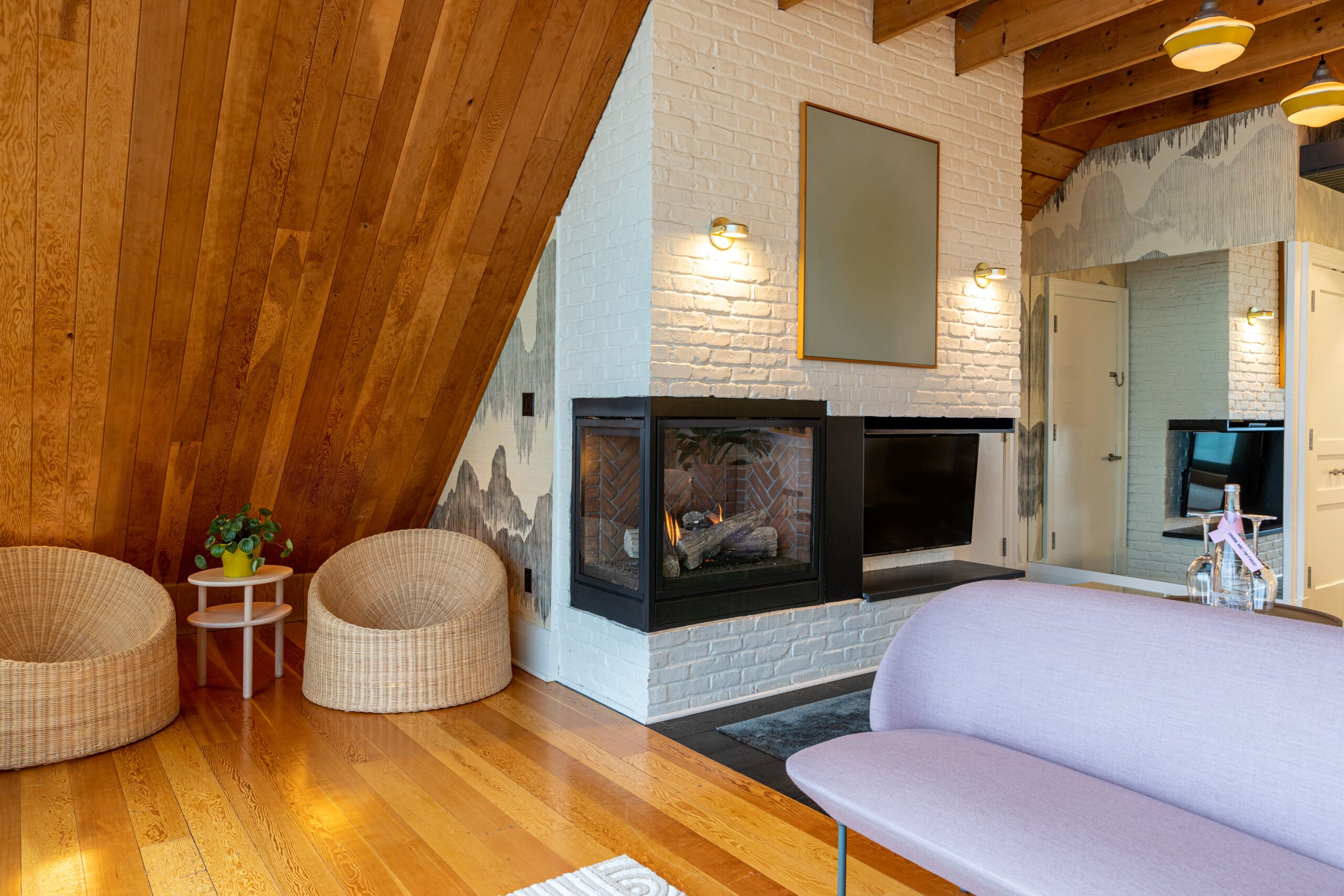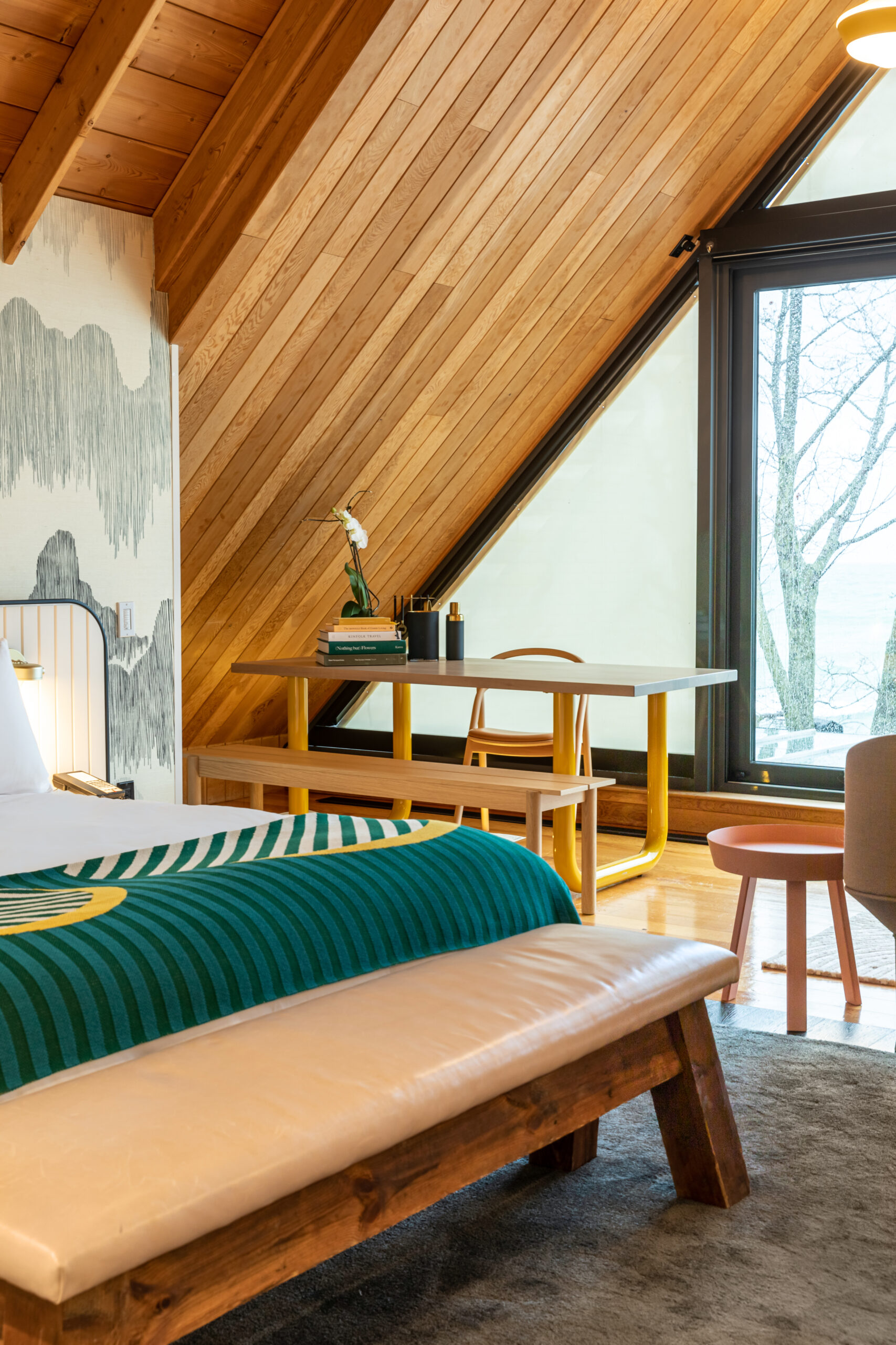 The Devonshire’s award-winning Owner’s Suite (enRoute Hotel Design Awards) is a luxurious retreat for those who crave both style and comfort. With what we consider the best view of Lake Ontario in the County from a private, expansive balcony, this grand A-frame suite features soaring wood-paneled ceilings, a cozy fireplace, and a lavish bathroom designed for pure relaxation. Grasscloth wallcovering, sculptural lounge chairs, custom furniture, and original artwork bring a refined, artistic touch to the space. Still, it’s the impeccable craftsmanship of the gabled ceiling and those sweeping lake views that truly define this extraordinary suite—making it the ultimate escape.